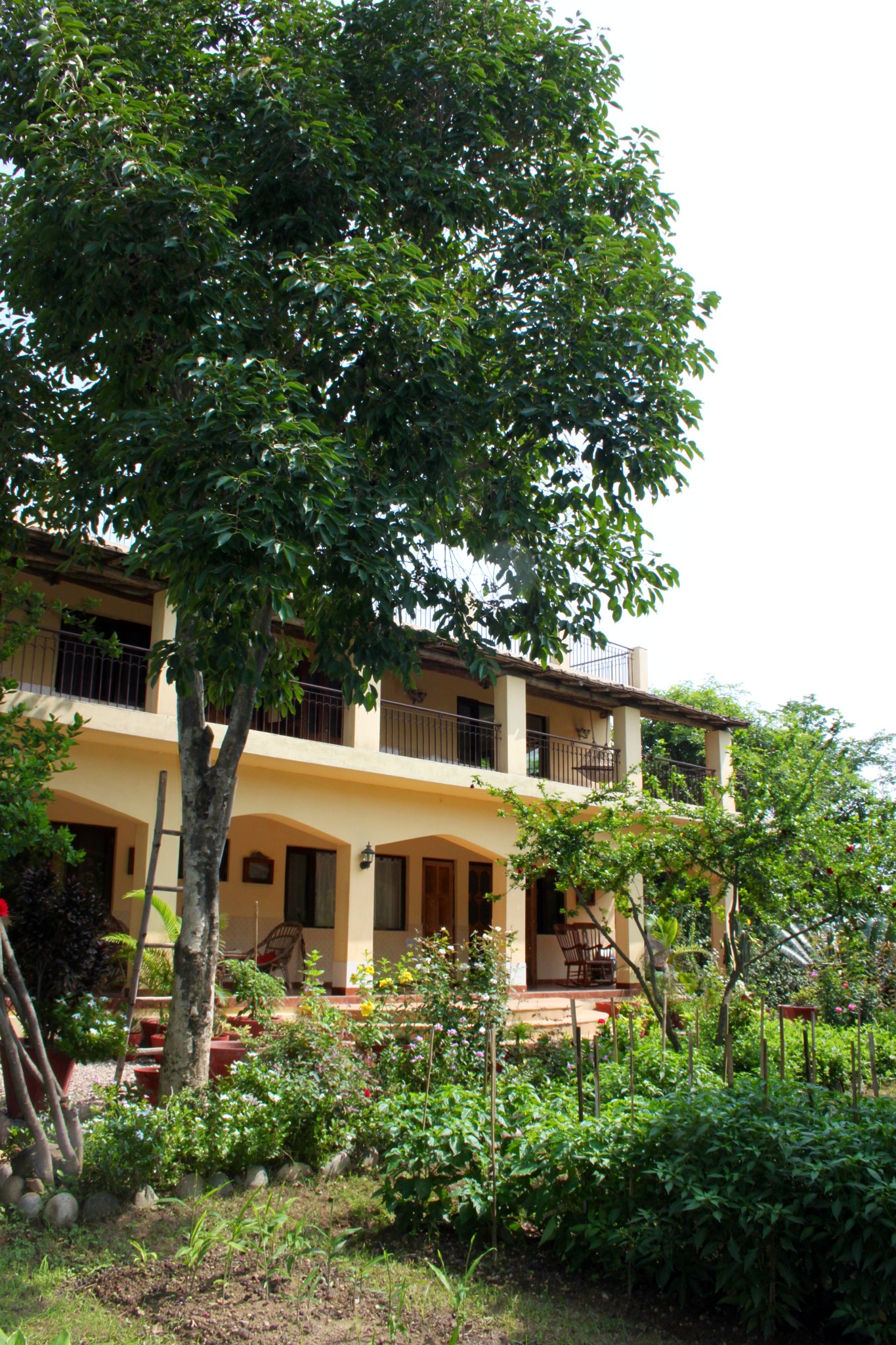 The Java Plum Tree, which was grown from a seed. This was flicked into a bed six years ago, when Raju and Rajinder were having tea and eating Jamuns. Jamun is the local name for the fruit and the tree this year is producing huge quantities. The fruit looks and is about the same size as a very large, black, shiny olive. It also has a similar structure, with firm outer flesh and a single large stone inside.